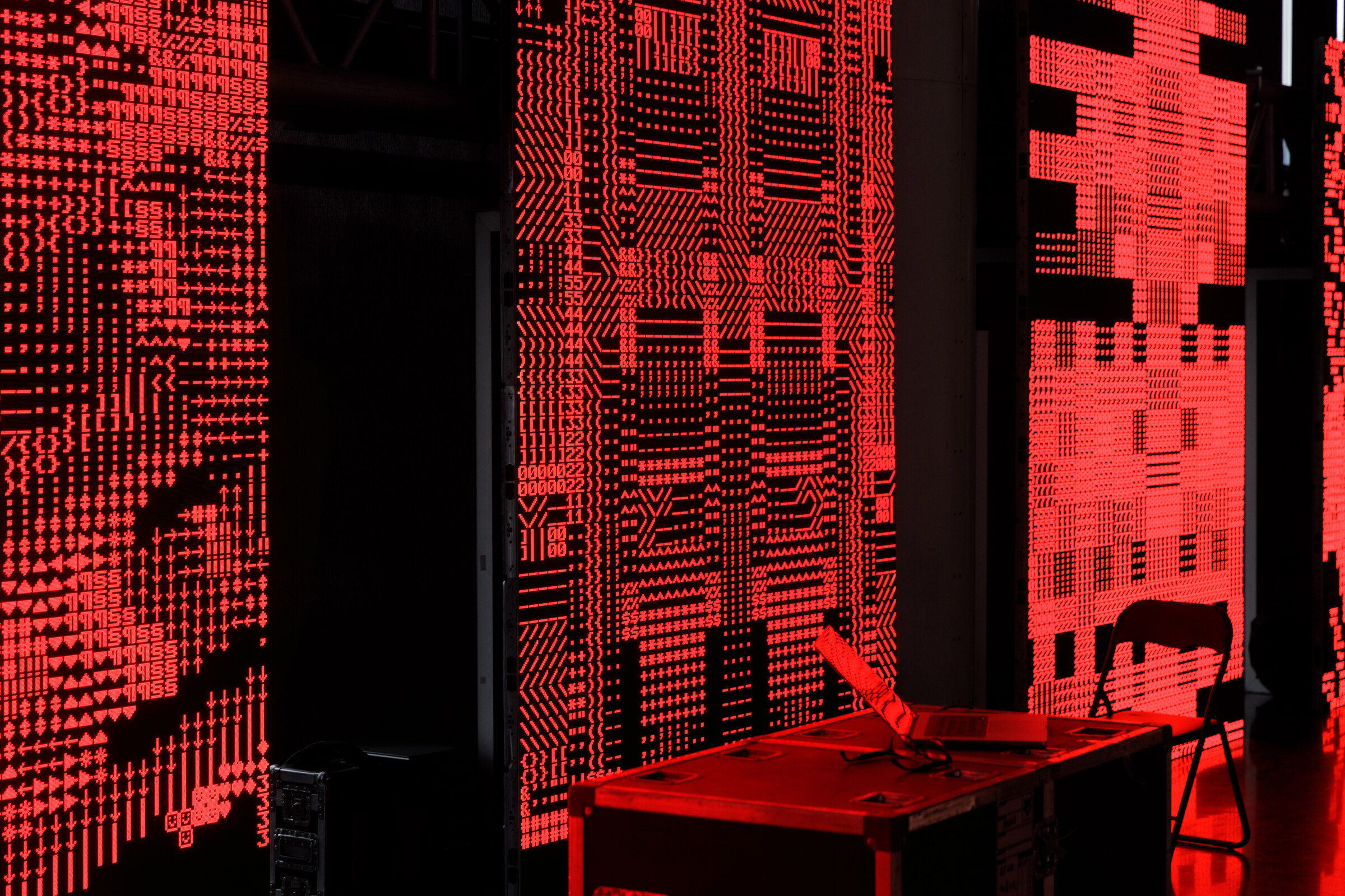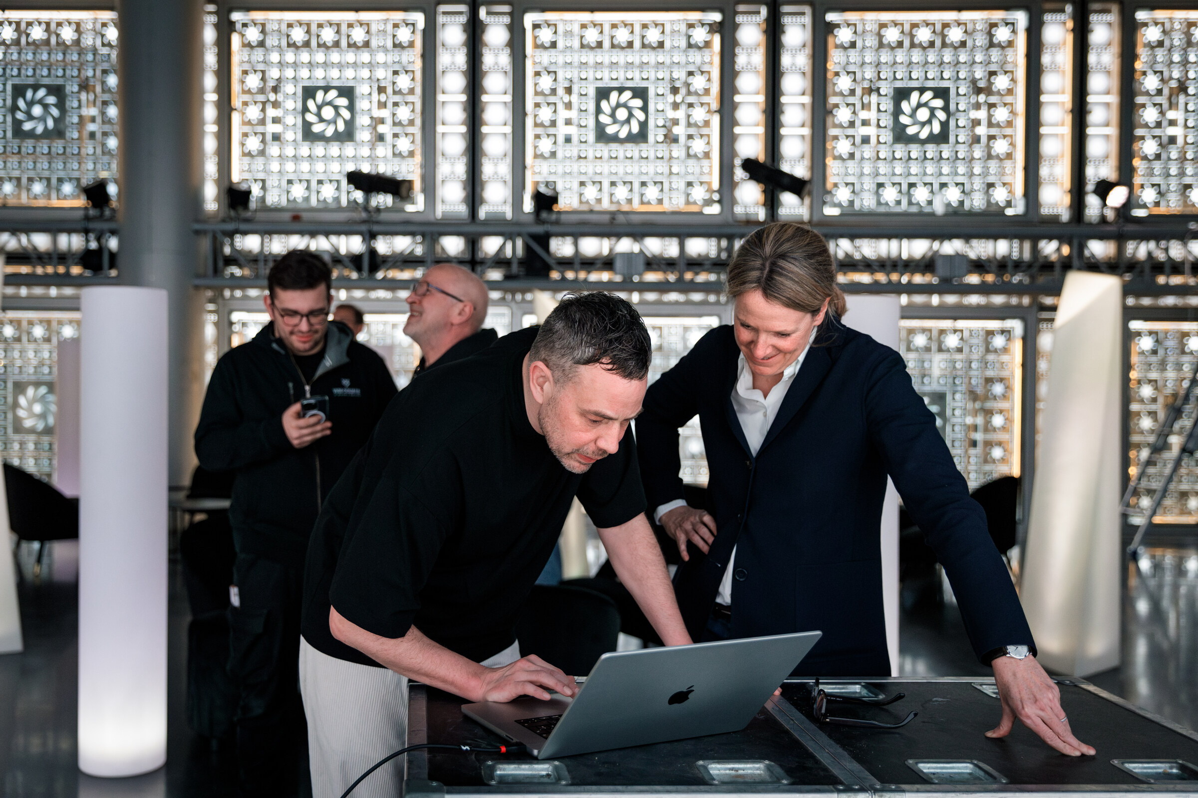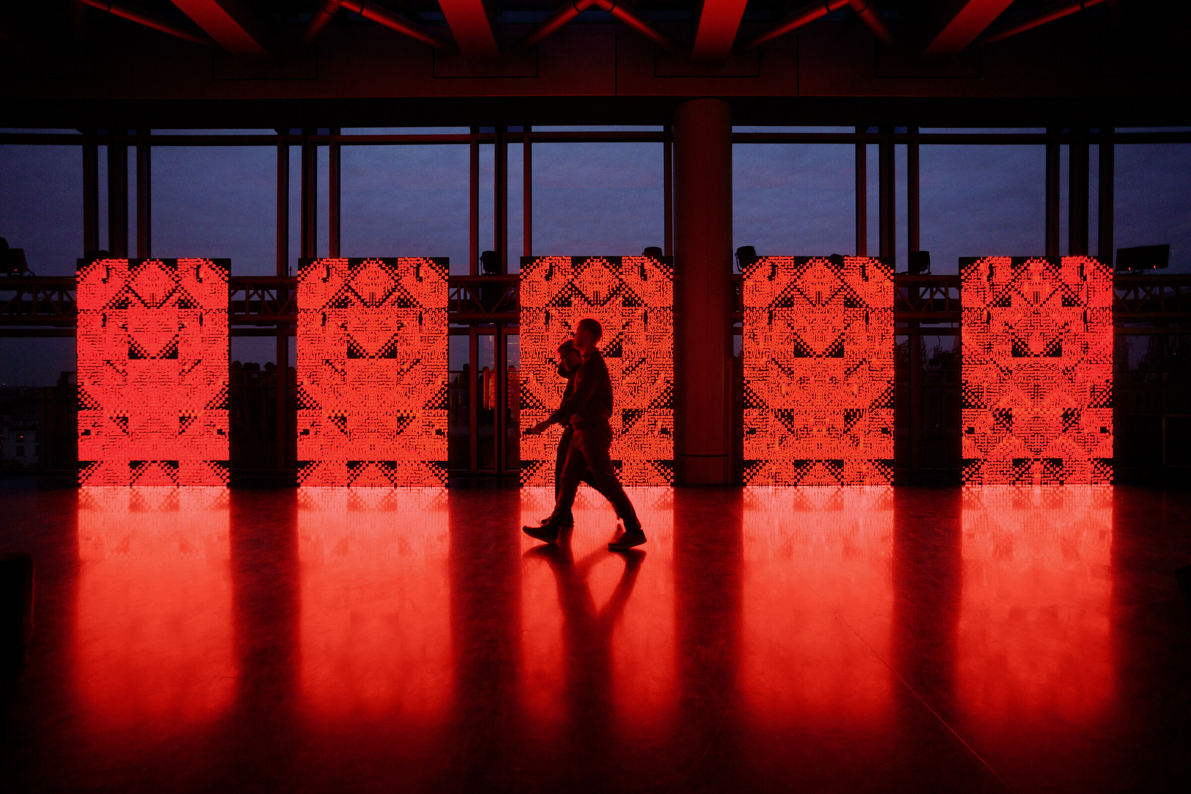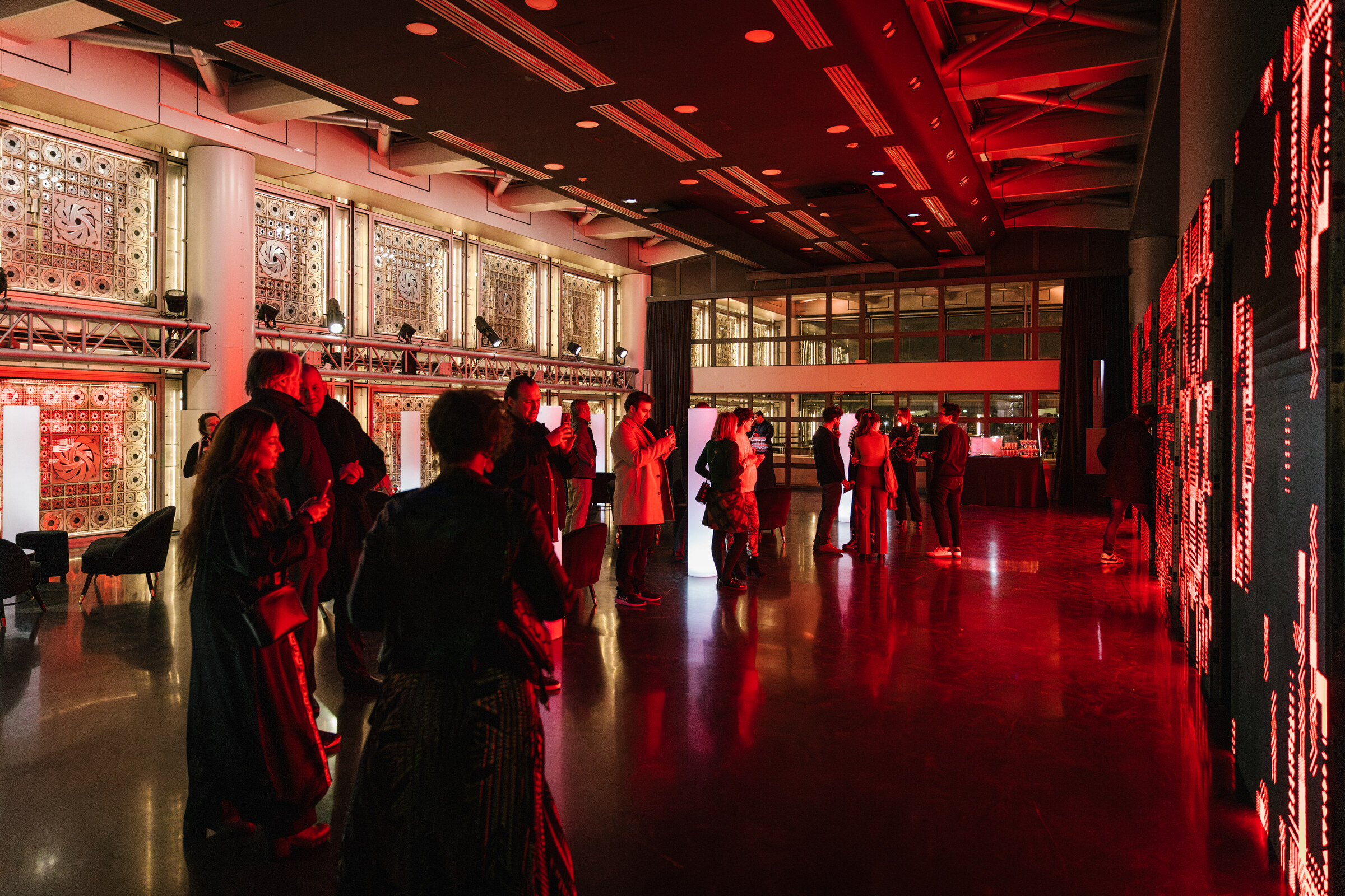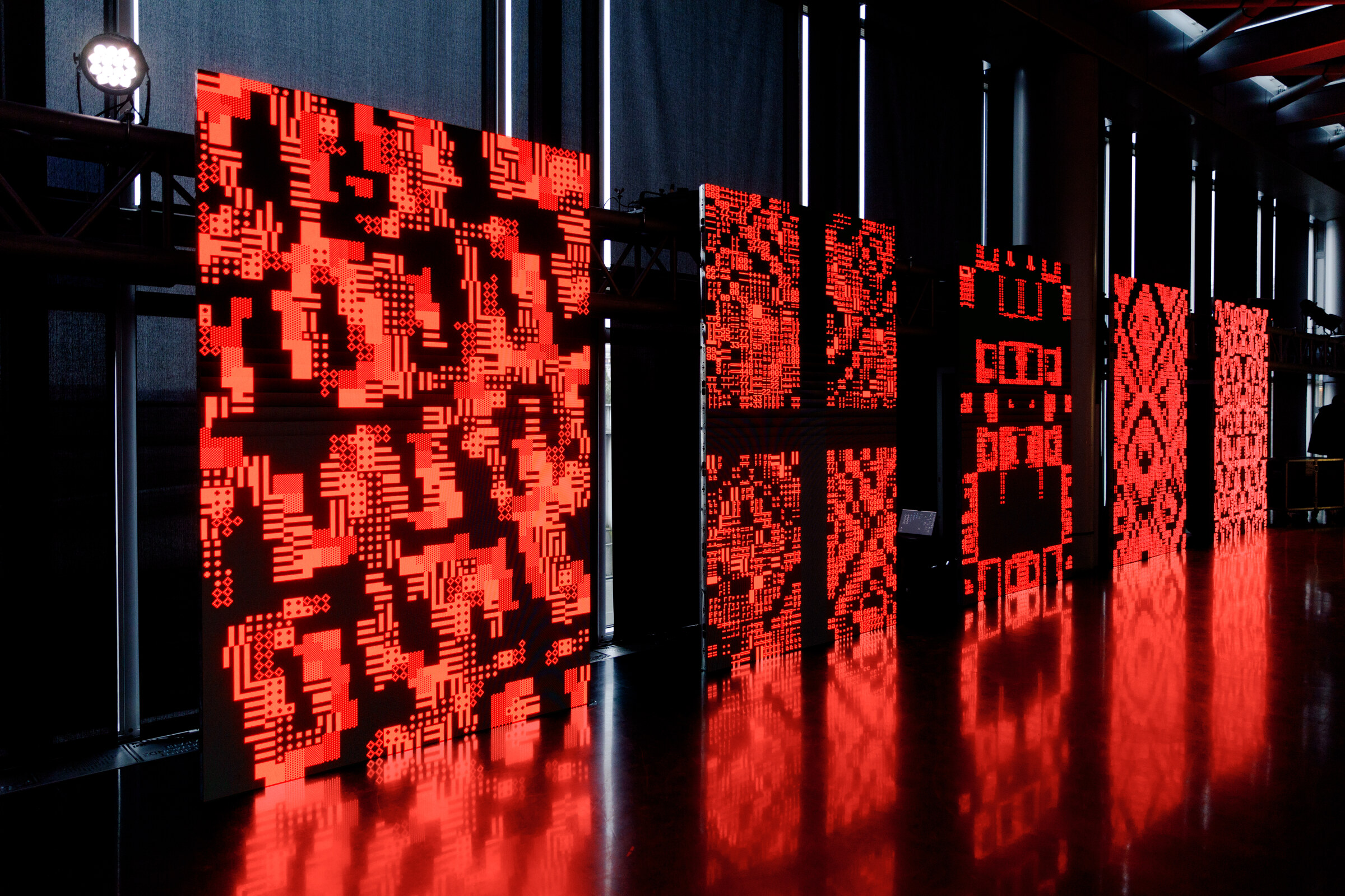 Lattice is presented on five synchronized 2×3 meter LED screens facing the mashrabiya-inspired mechanical apertures on the opposite side of the space.