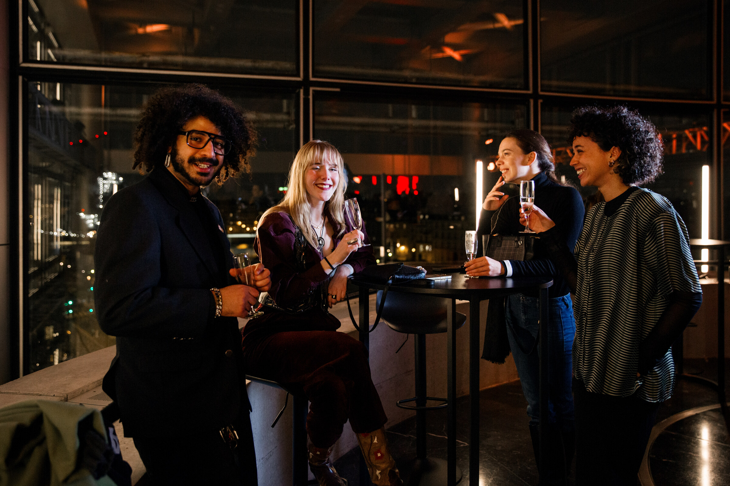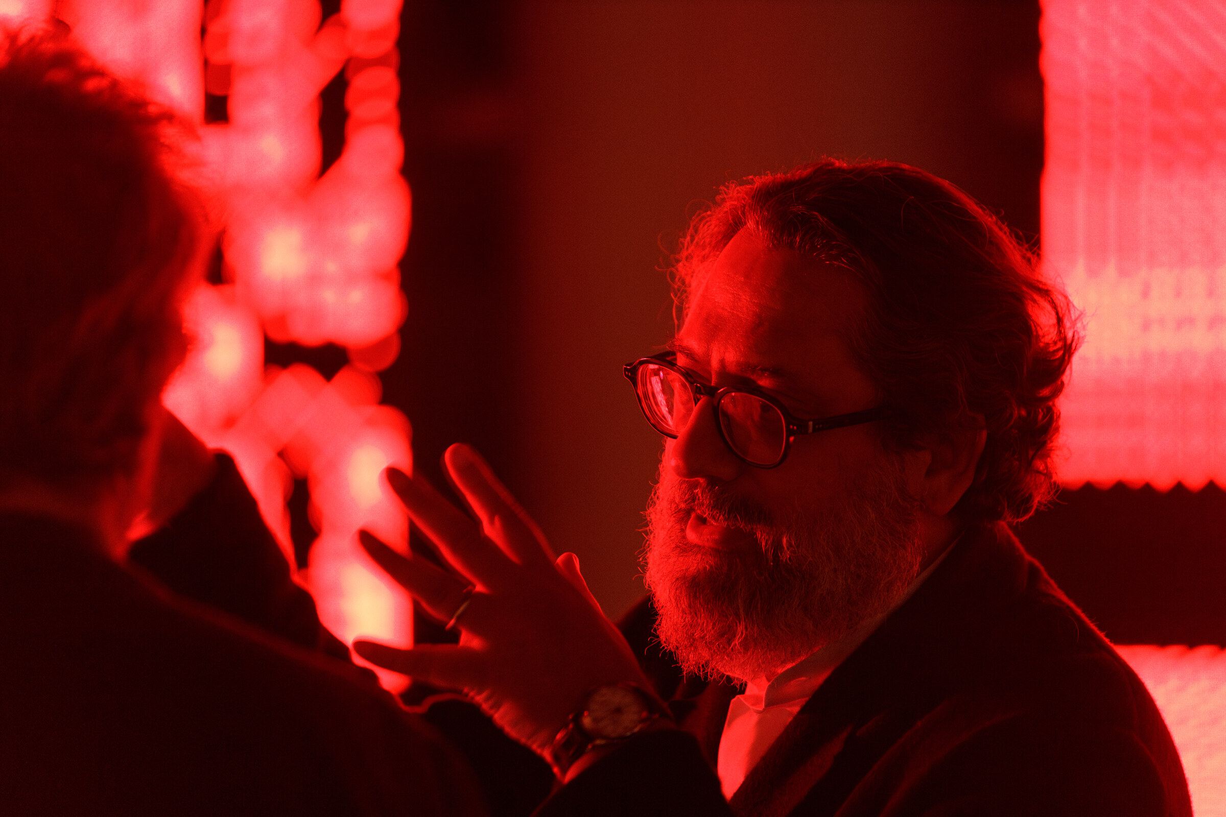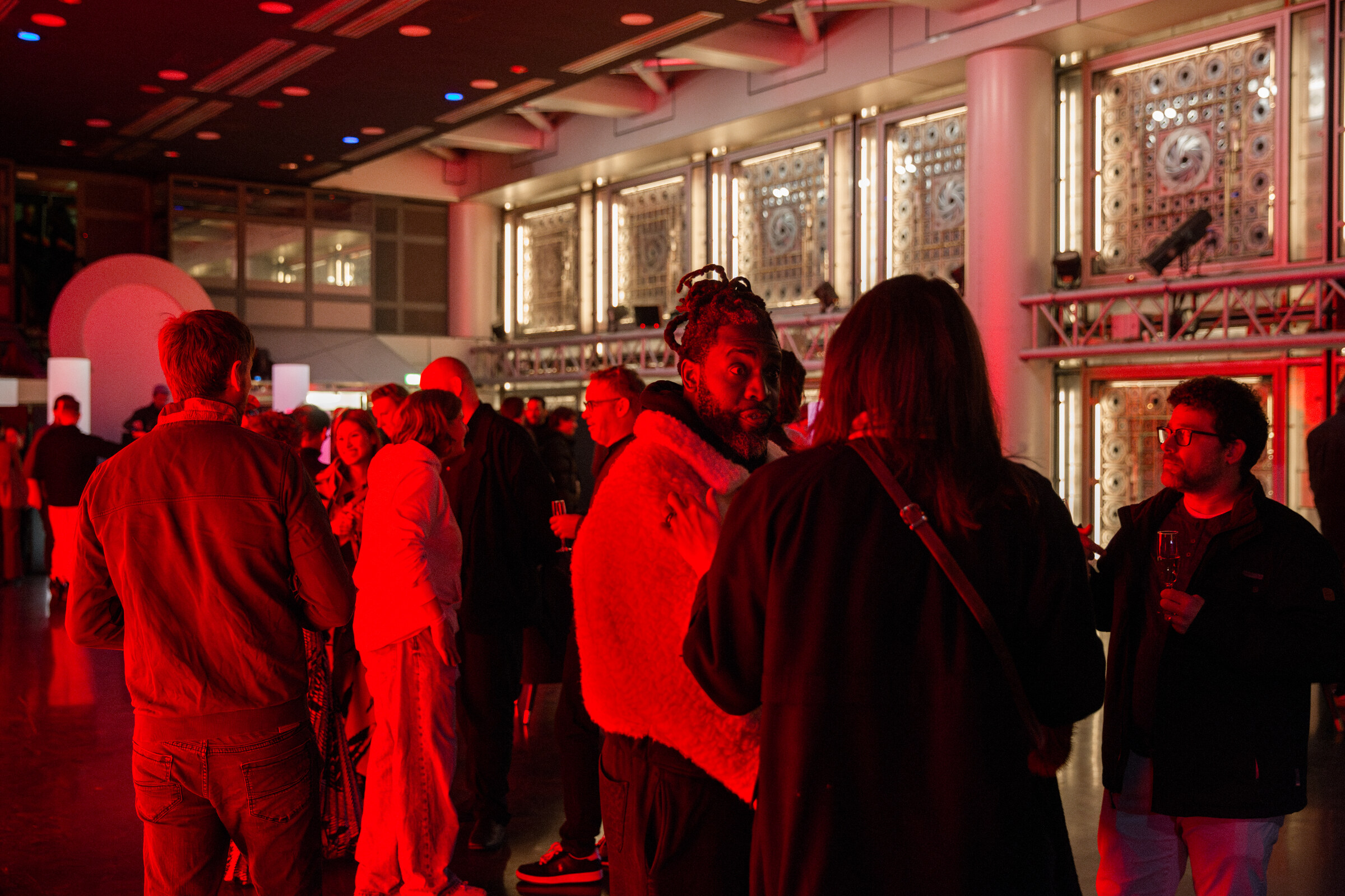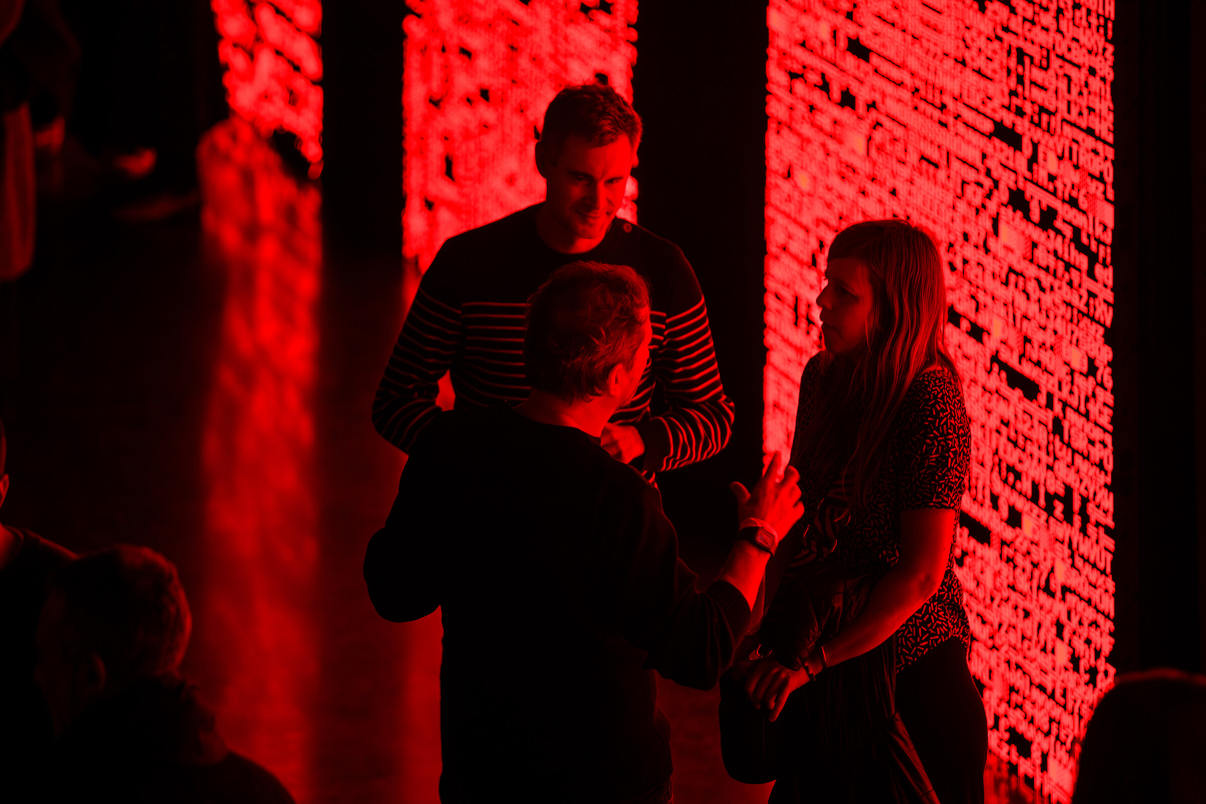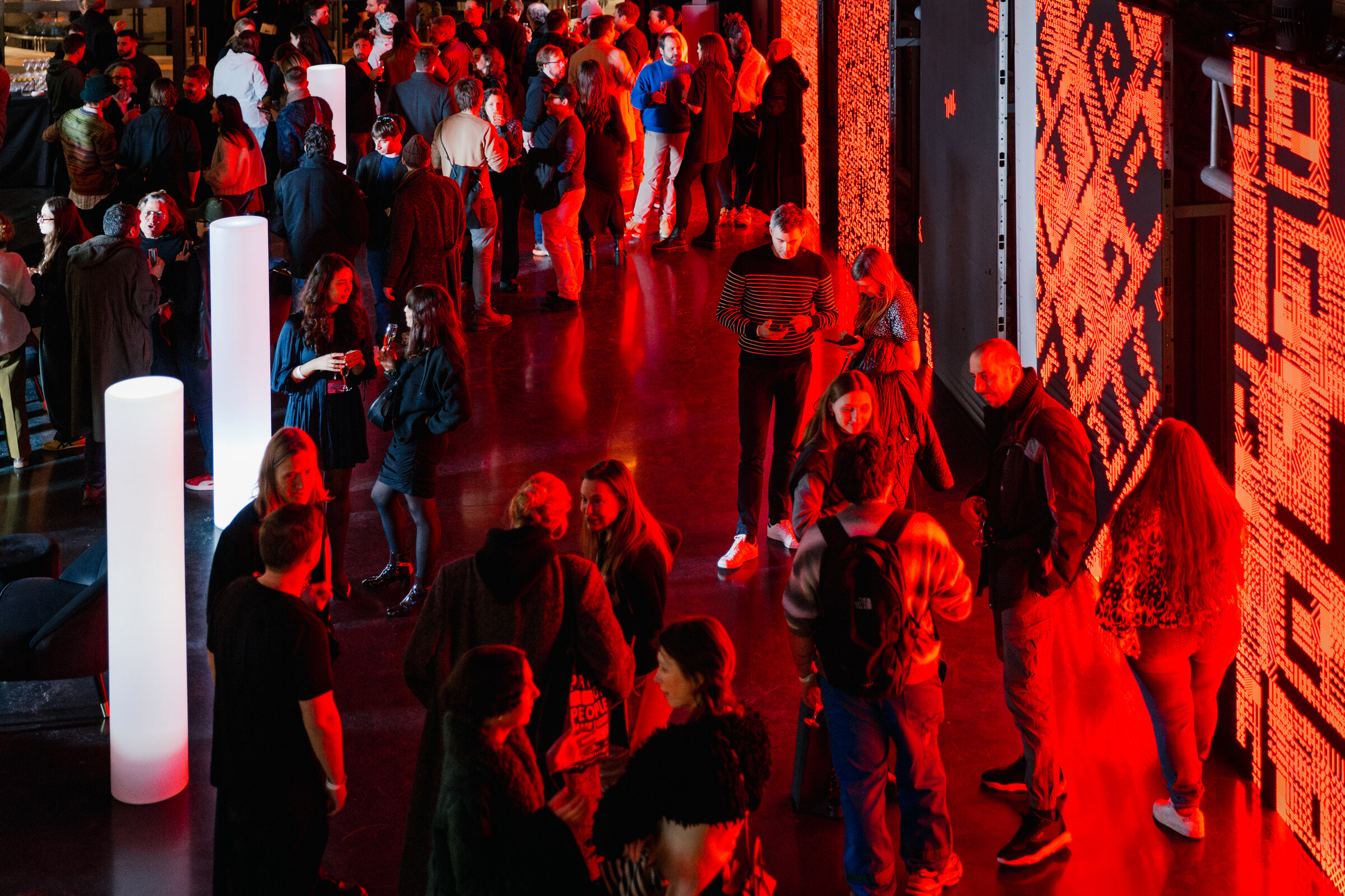 Lattice is presented on five synchronized 2×3 meter LED screens facing the mashrabiya-inspired mechanical apertures on the opposite side of the space.